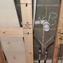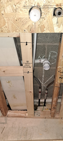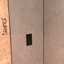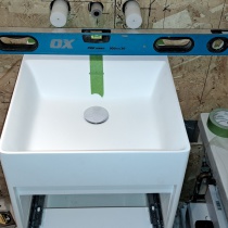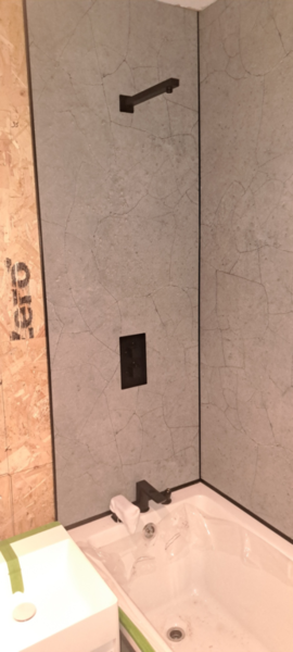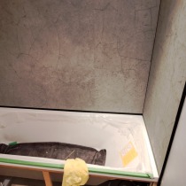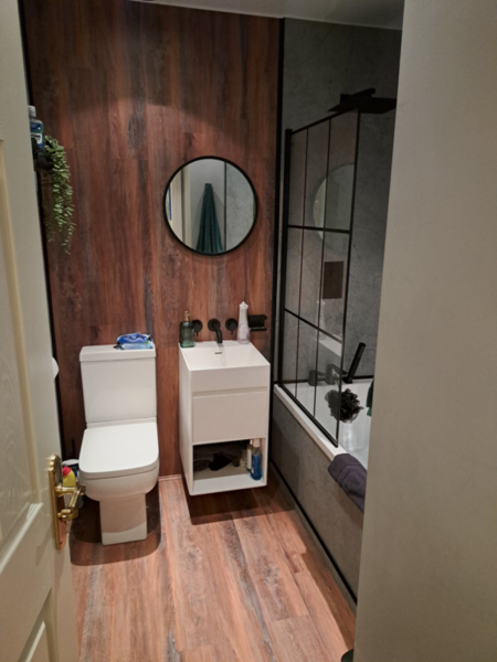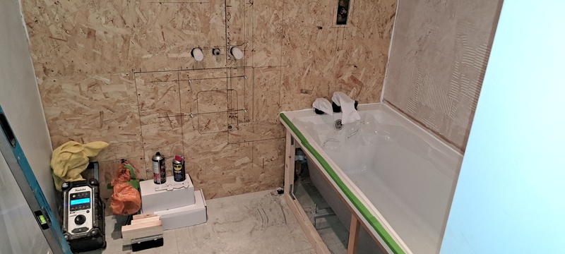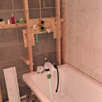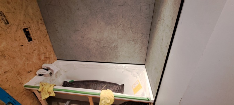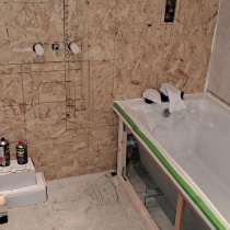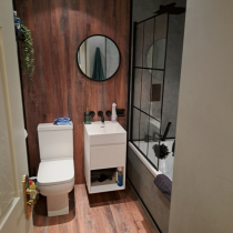 Friend of mine wanted to revamp his bathroom. He picked some really snazzy stuff too!! The sink was 23 kg, so I had to strip the old wall out and build a new reinforced stud wall. He then said that he wanted the Karndean LVT flooring to continue up the wall!! It was all very emotional!!