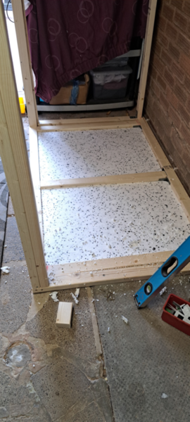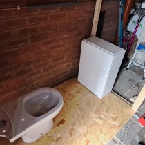 Garage was being used as a utility room. Elderly parents were struggling with the stairs, so I was asked to fit a small toilet. I used a Macerator to service the sink and the toilet. Walls were insulated and a lowered ceiling installed.